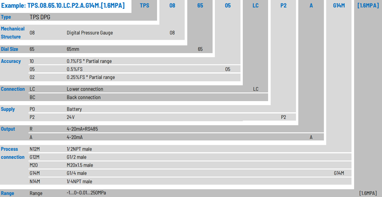 TPS.08-seriens digitale trykmåler er en enhed, der nøjagtigt og i realtid kan vise tryk, med funktioner som lavt strømforbrug og god langtidsstabilitet. Den er udstyret med en LCD-skærm og har flere funktioner såsom nulstilling, baggrundsbelysning, tænd/sluk, enhedsskift og lavspændingsalarm. Den er nem at betjene og installere. Produktet vedtager en rustfri stål 304 skal og led, som har god vibrationsmodstand og kan måle ikke-ætsende medier såsom gas, væske, olie osv. Det bruges i bærbar trykmåling, matchning af automatiseringsudstyr, trykbeholder og andre målefelter.